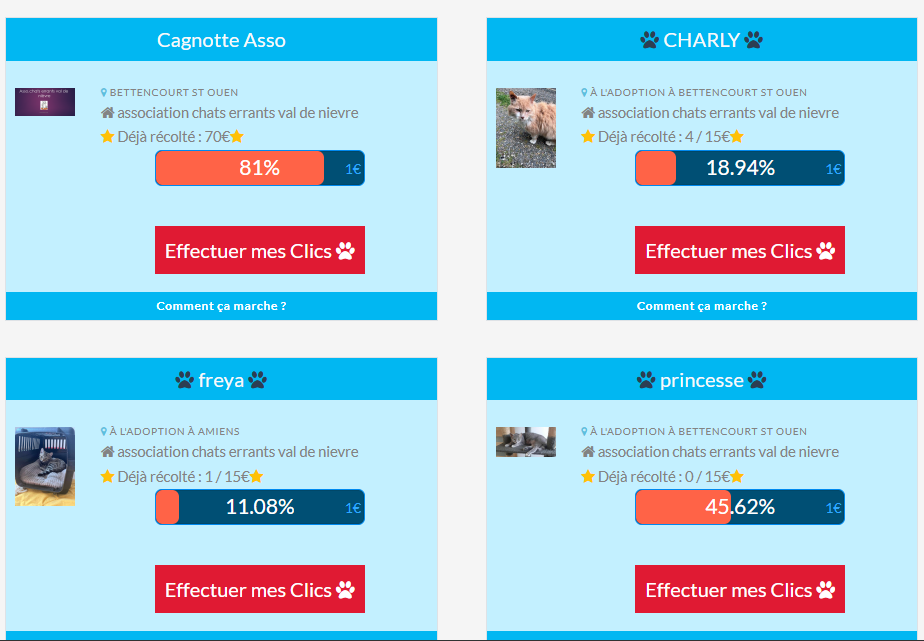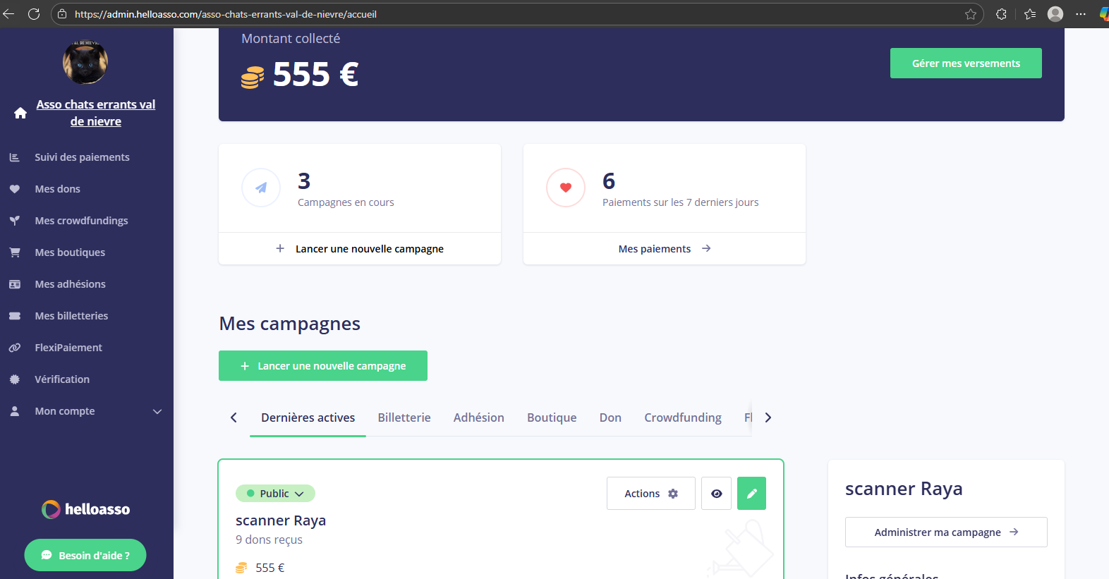 Hello Asso: mise en place de cagnottes pour nous permettre de poursuivre les stérilisations des chats errants, les prises en charge de chatons et les soins des chats et chatons accueillis.