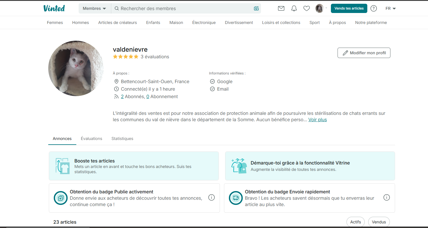 Grâce à Vinted nous mettons en vente divers articles pour nous permettre de récolter des fonds: nom du profil: valdenievre